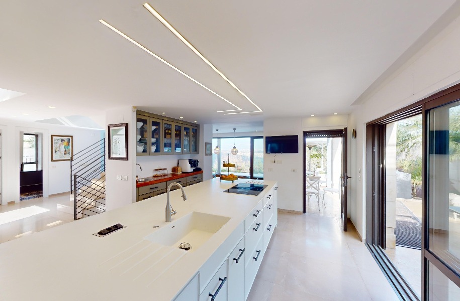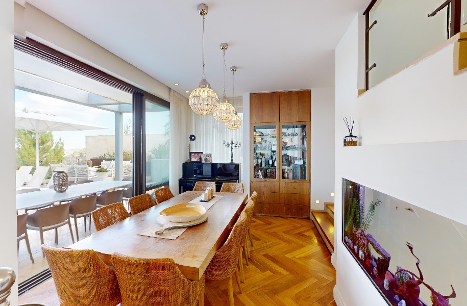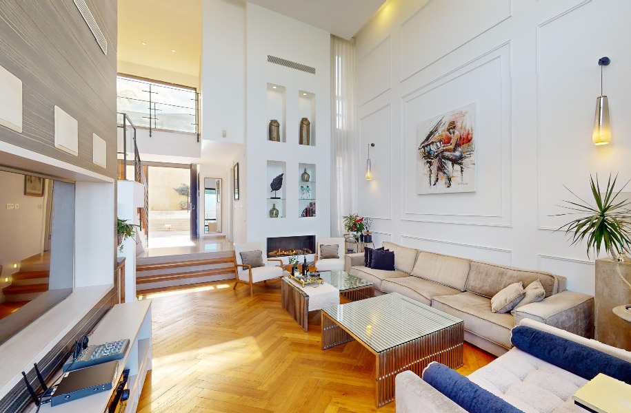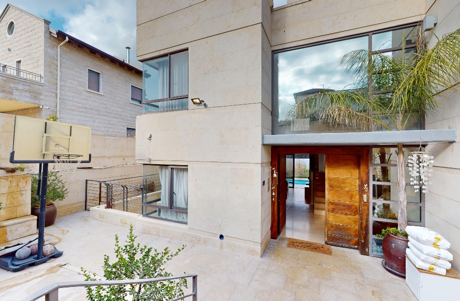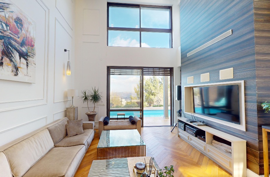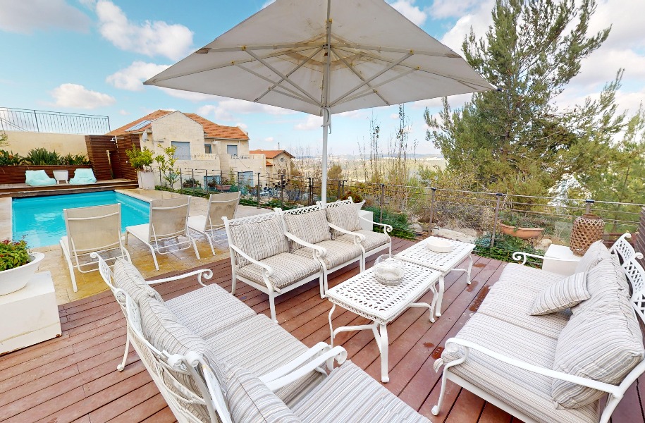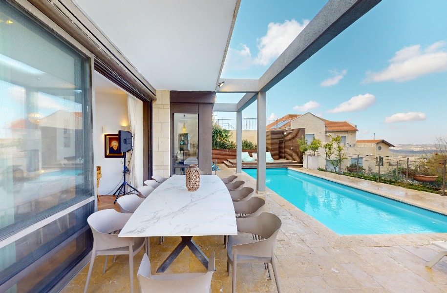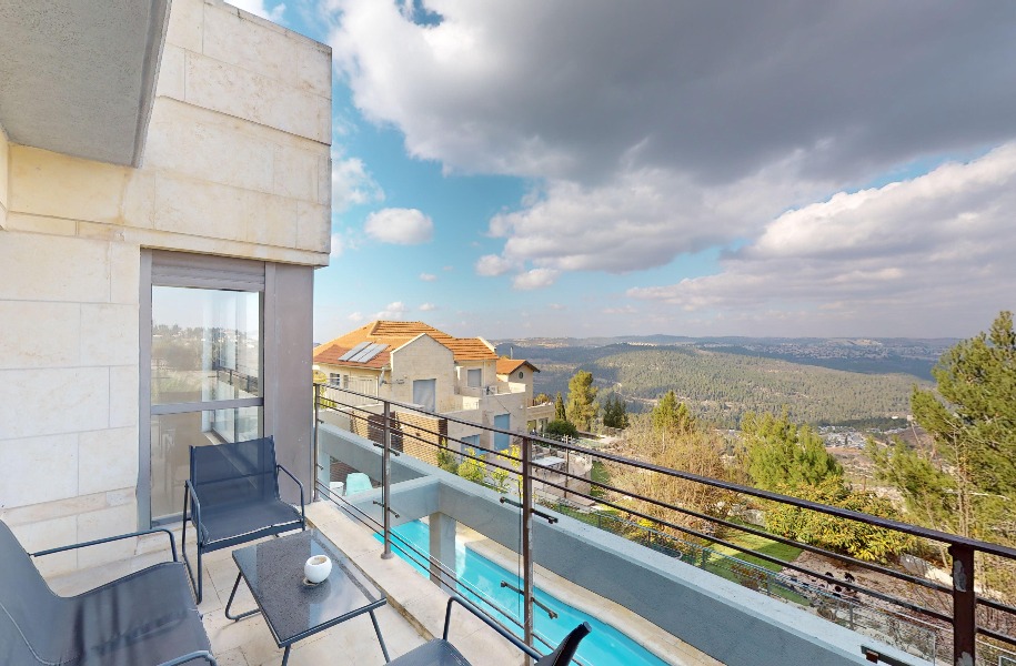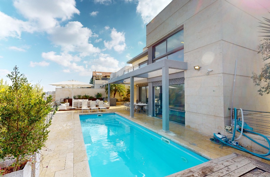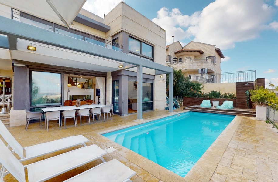 Luxurious, renovated villa with a heated pool and stunning views! 247 sqm (approx. 400 sqm actual) built area, 9 rooms, 8 bedrooms, 2 master suites, guest suite with separate entrance, 5.5 bathrooms, spacious living room with high ceilings (5.3 meters), huge kitchen with a island and garden access. Includes central A/C, underfloor heating, private parking, pastoral location and near shuls.